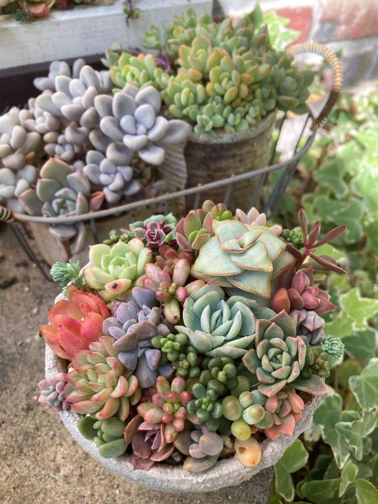 寄せ植え、いろいろ入って色目も綺麗だね〜😃💓 後ろの葉挿しちゃんも、モリモリですごいなぁ〜😋 ここからも寄せ植えに入れれそうでいいね҉*\( * ॑˘ ॑* )