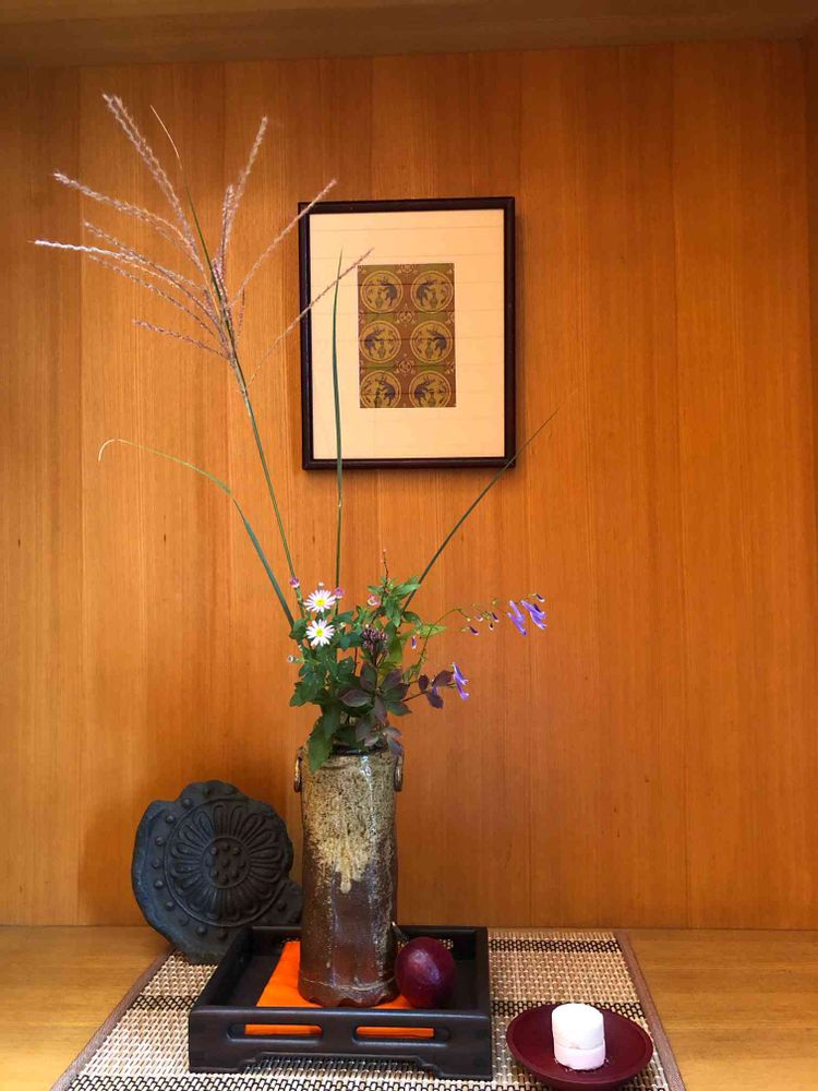 お下がりの落雁とちょっとすました玄関です。暴れん坊のアキチョウジが良い感じを出してくれました。