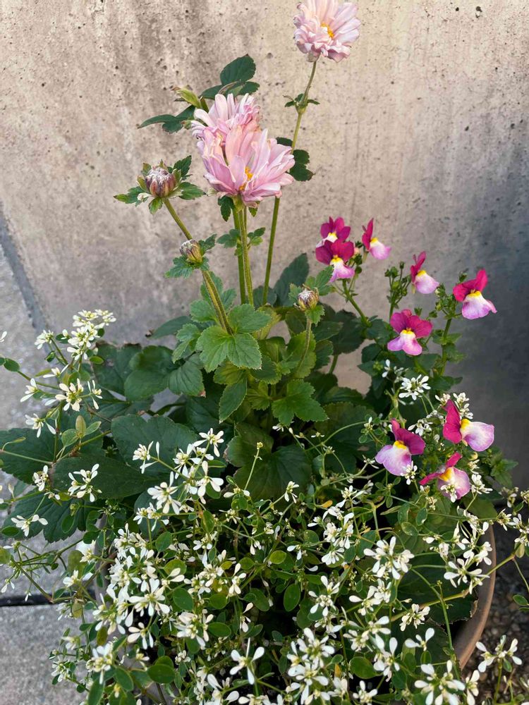 ピンク系のネメシア、白いユーフォルビアと寄せ植えに💕