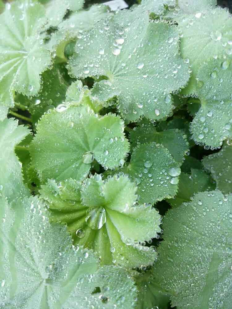 雨上がりの楽しみはこうやって水滴を弾く葉っぱを見ること。これはレディースマントル。