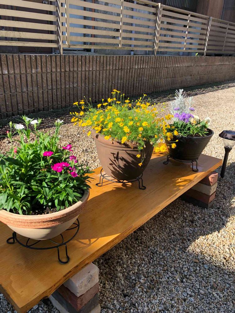 花台はホムセンの安レンガと材木問屋で500円で買ってきた端材を防虫防腐塗装して作りました、、って、乗せただけw