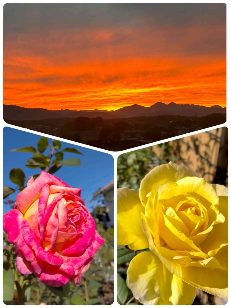 黄色にピンクのバラ🌹さん燃えるようなオレンジに黄色の夕焼け🌆