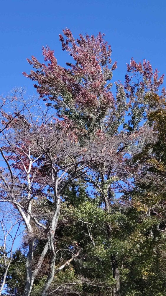 自宅前の小さな山にある背の高い木の先端が赤く色づいていました🍂🍁❤️