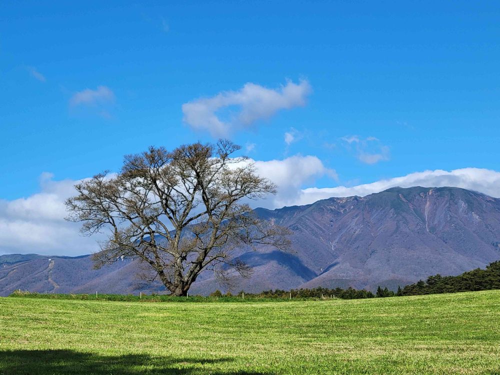 アップで📱歩道から入っていけないの!牧草地にもなってるからね!一本桜🌸なかなか良いよ🌸🌸満開にまだ2回ほど。鳥に食べられたり早かったり遅かったり…それで景色最高。春は雪が残ってるなよ。