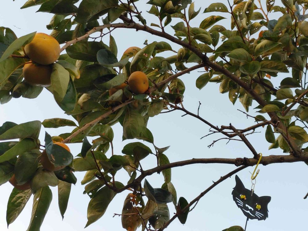 あまりにうるさくて 柿の木に猫ちゃんの飾りを吊るしてみました。