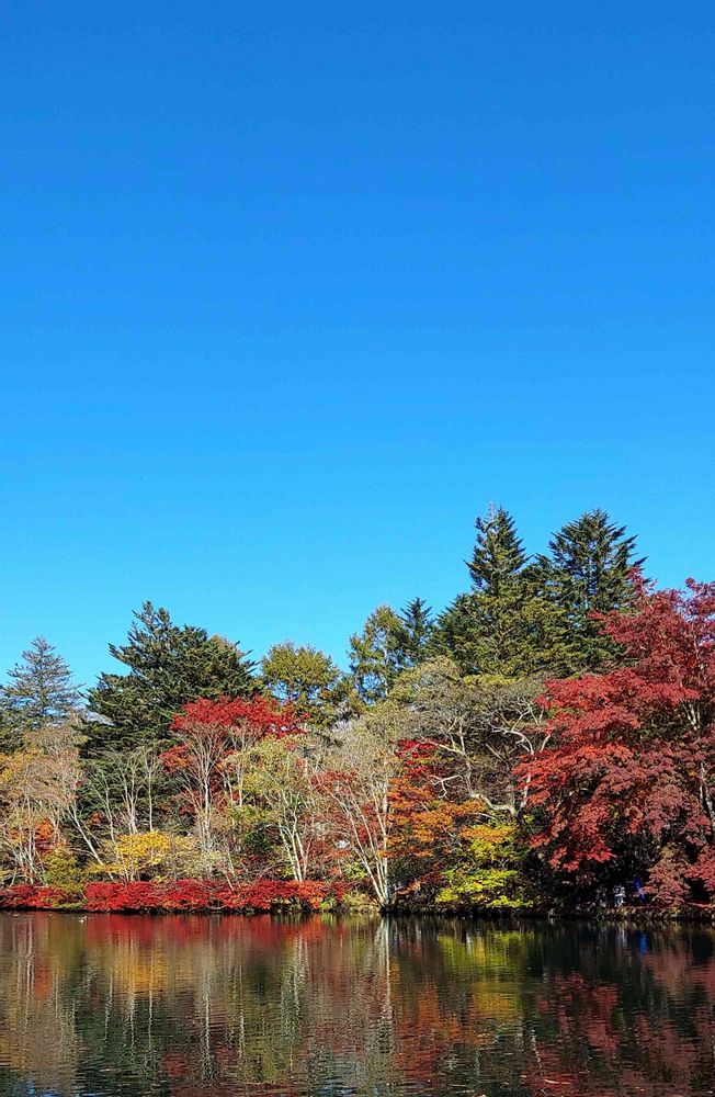 青空と水面に色とりどりの紅葉が映えて♩♬♡゚*。