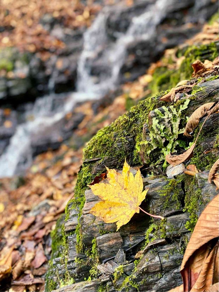 冷たい岩の上の一枚の落ち葉 もうすぐ来る冬の寒さを感じます