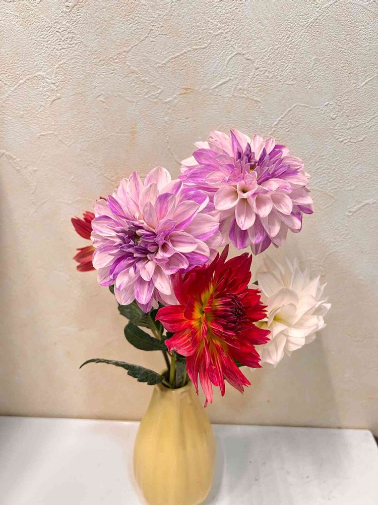 紫と白のダリアがきれいでしたので、お家に飾りました。