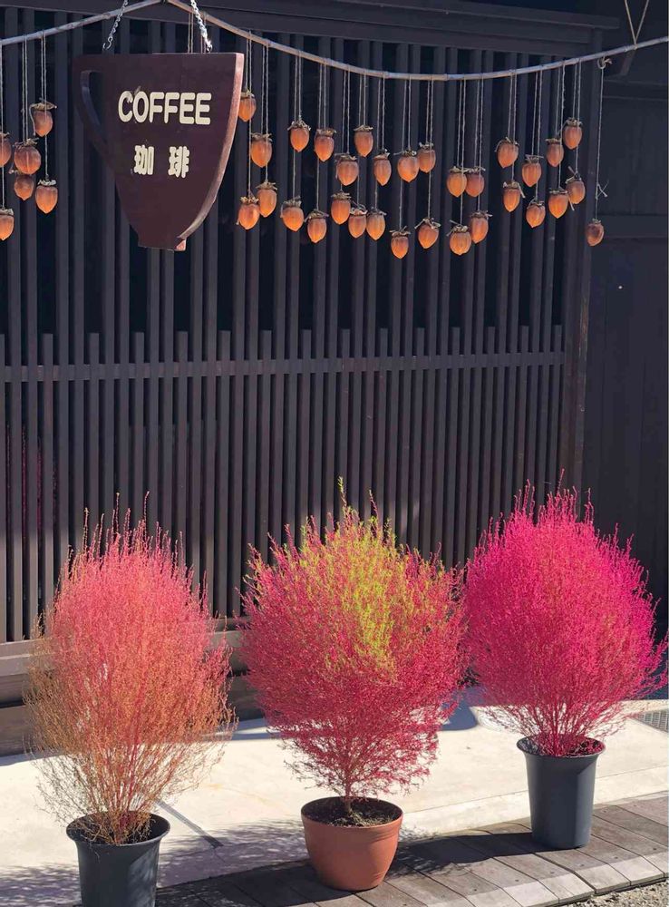 微妙に色違いのコキアが、レトロな古民家カフェに風景として溶け込んでいますね〜💚🧡♥️