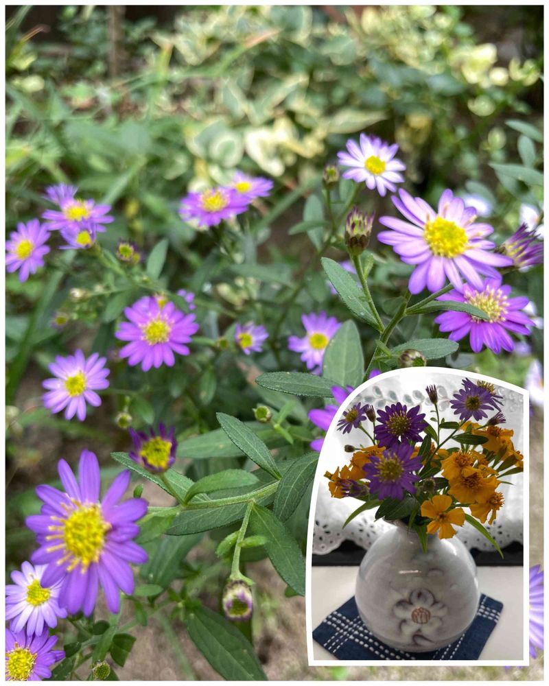 花瓶のマリーゴールドとエゾノコンギクがとっても可愛く生けられていますね〜🧡💜