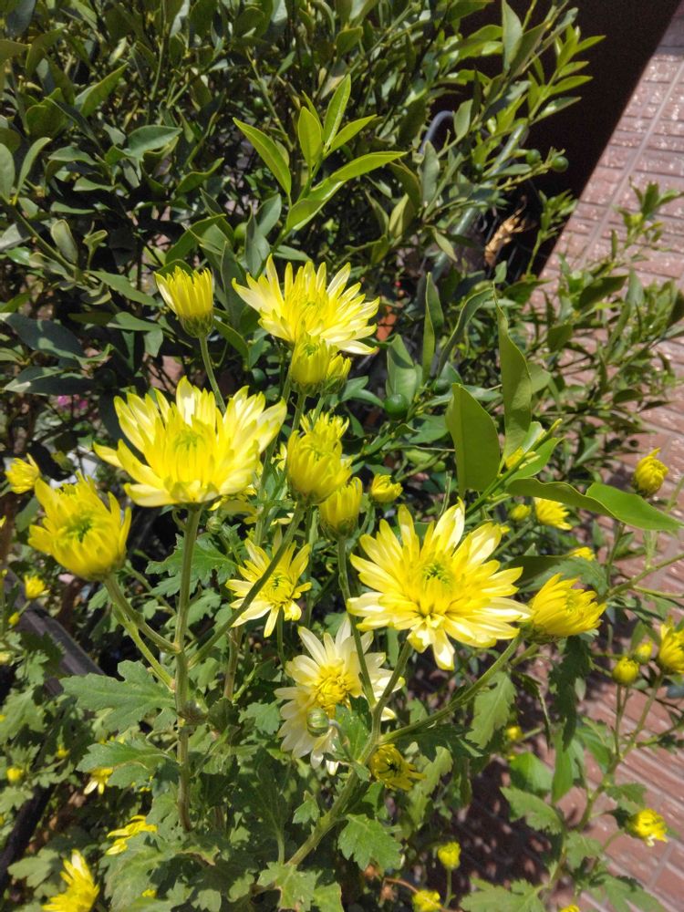 雨 風 で 倒れないようにしないとね〰️💦ウチのガーデンマム こんもりまん丸の形が 夜中の風雨で 真ん中から パカッと いっちゃった😱今は 真ん中に支柱立てて 麻紐で立て直ししてます😅カッコ悪〰️💦