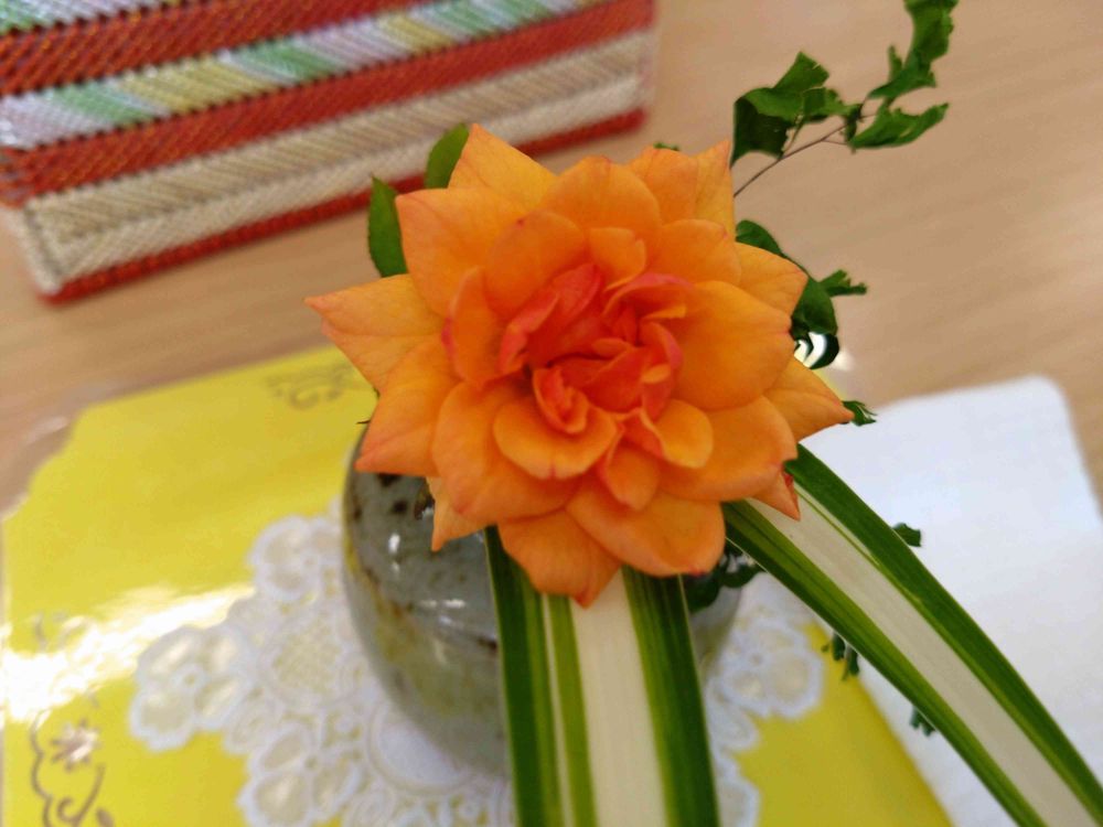 オレンジのミニバラ🏵️とオリヅルランの斑入りがいいバランスでしょう‼️💕