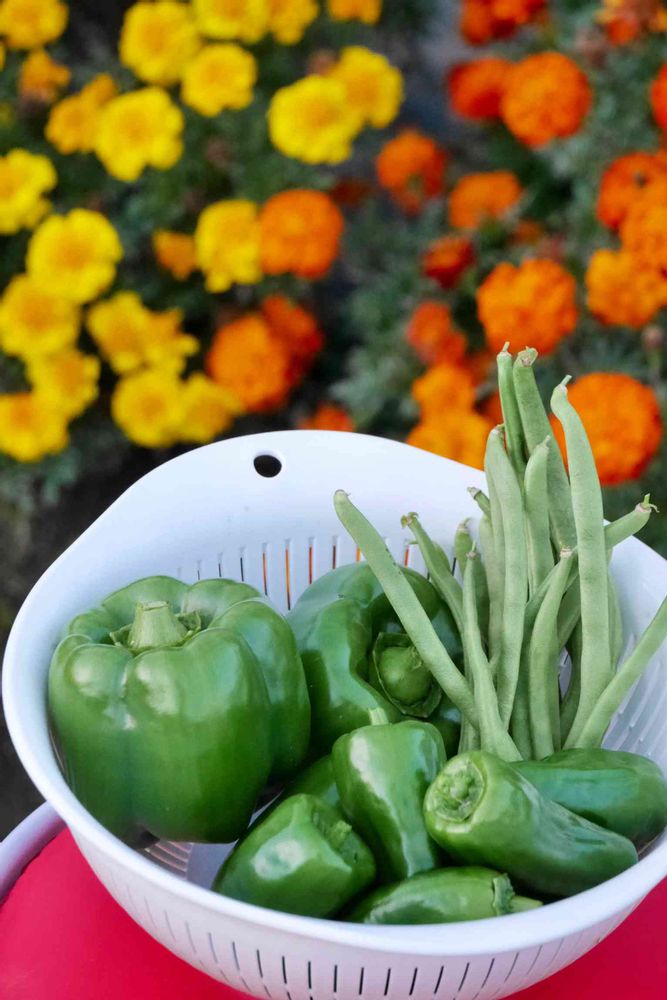 緑の野菜しかないのでマリーゴールドを背景にして彩りを追加📷