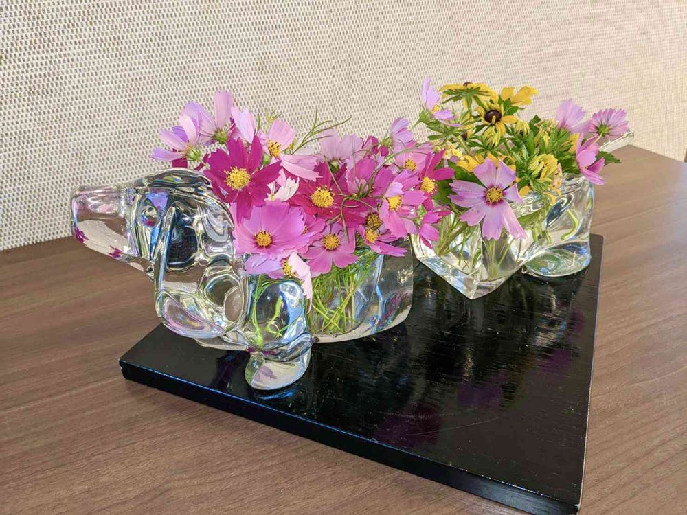 職場のコスモス…可愛いダックスフントの花瓶に生けてあります〜🌸