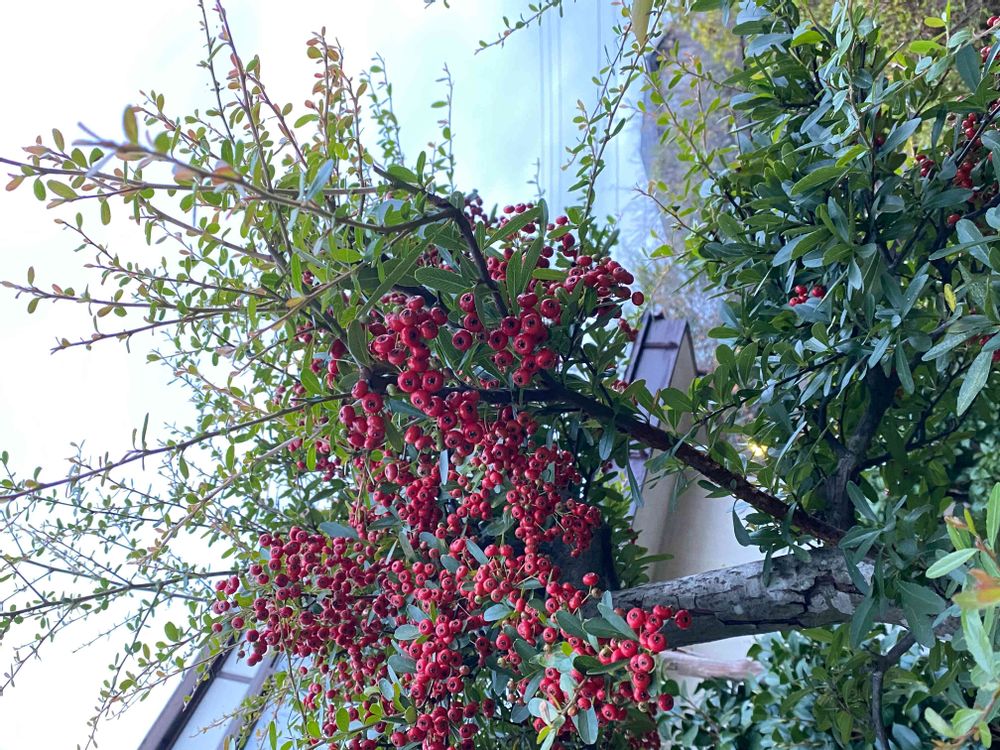 秋になり小さな5mmに満たない多くの実を赤く色付かせた、これはトキワサンザシ(常盤山櫨)だそうです。これを含めたいくつかの種を総じてピラカンサスとも言うそうです。