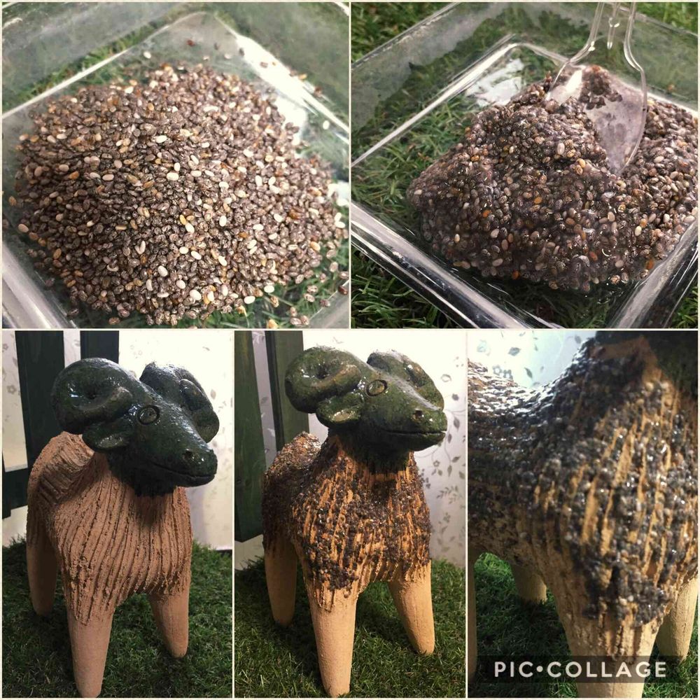 陶器でできたヤギさんの体の溝にチアシードの種を付けて1日〜2日で発芽して