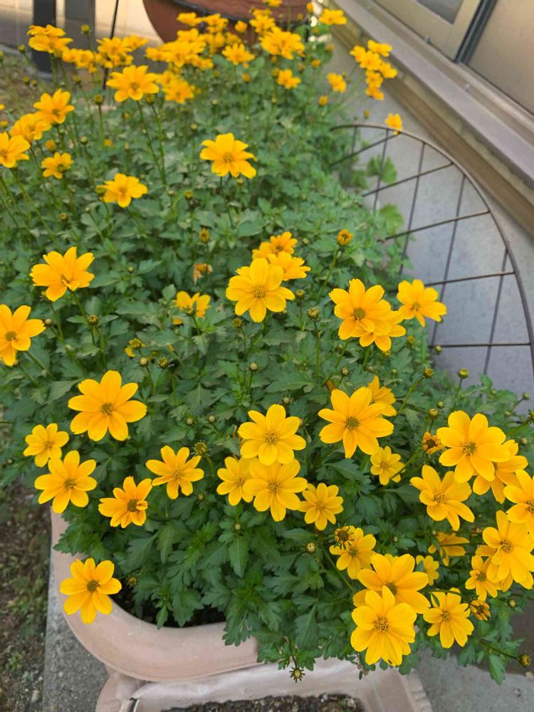 後ろにセリアの柵をつける作戦、良いです👍キク科のお花達が、沢山の蕾を付けてきてワクワクします😆