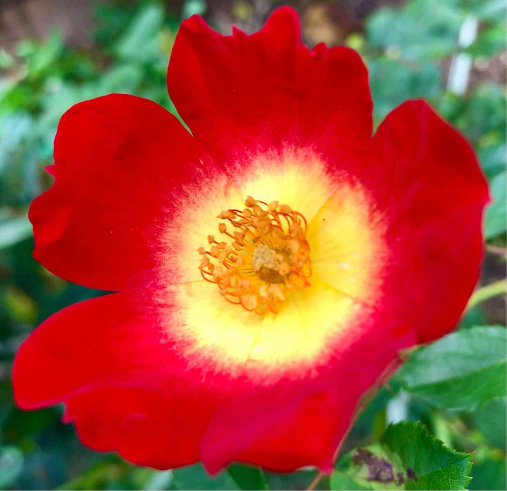 くっきりとした中央の黄色が 何とも美しい✨…大好きな一重の薔薇が咲きました🥰