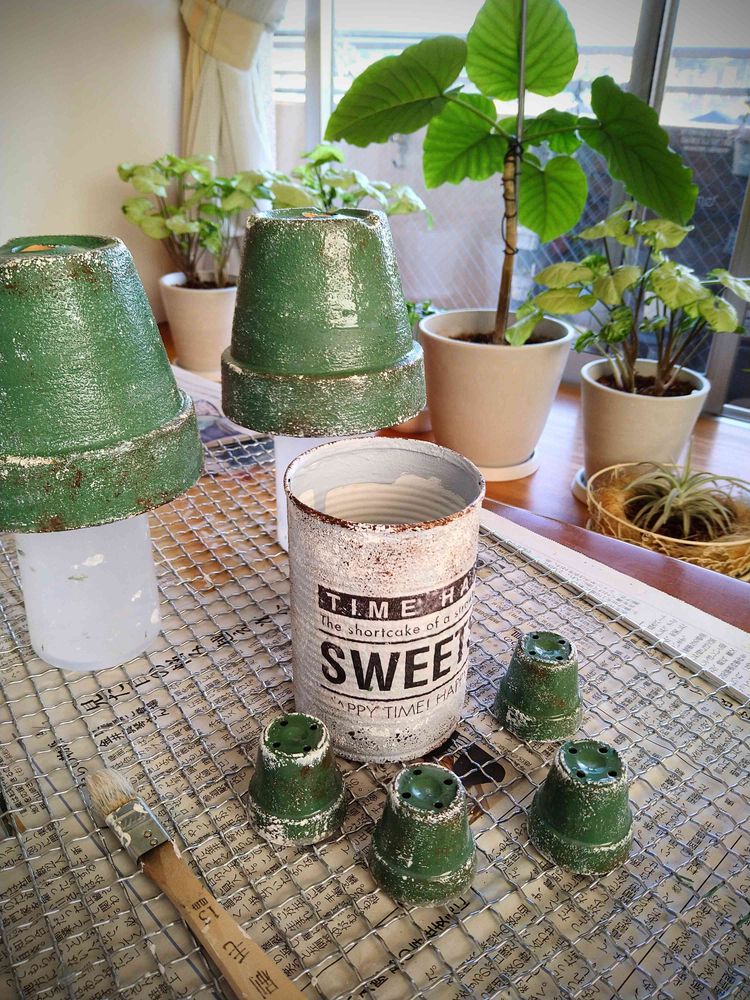 先程の白くペイントした鉢3つはコーティングせずそのまま使います。