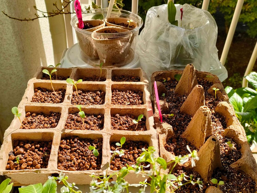 右の卵パックの方は自家採種ストック。矢車草のほうが茎が長くて葉も大きい🫶