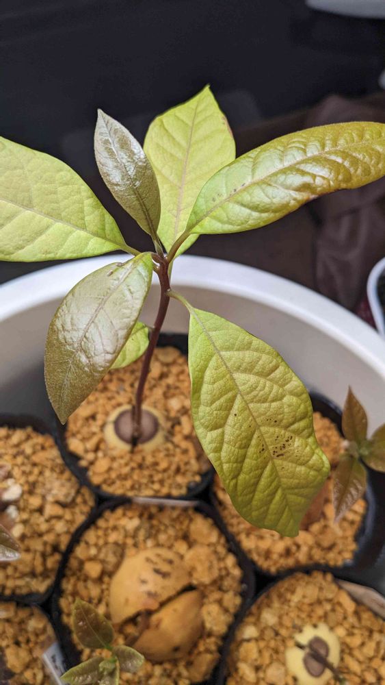 アボカド育ててみたくなって家で食べたものをひたすらポットに植えています。その他家で食べたフルーツの種をアボカドと一緒に実生苗にすべく日々観察中です。