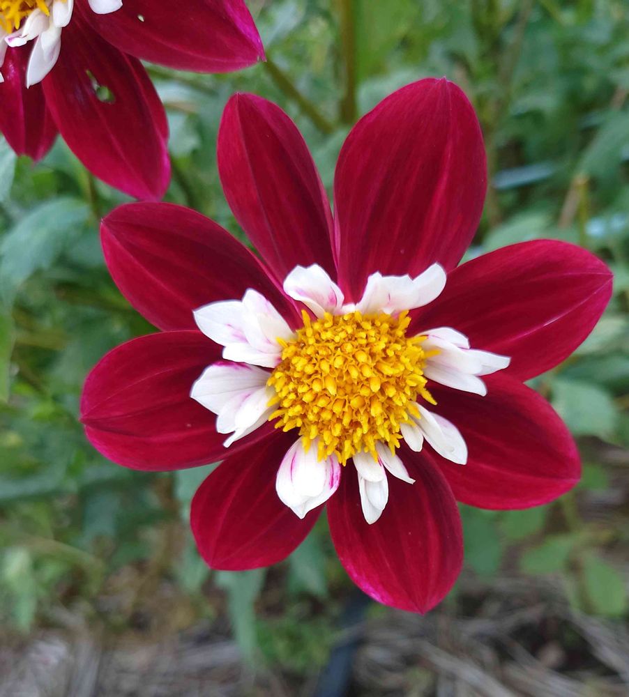 赤と白のダリア・メアリーエベリンの花、とてもユニークなコラレット咲きです❤🌿
