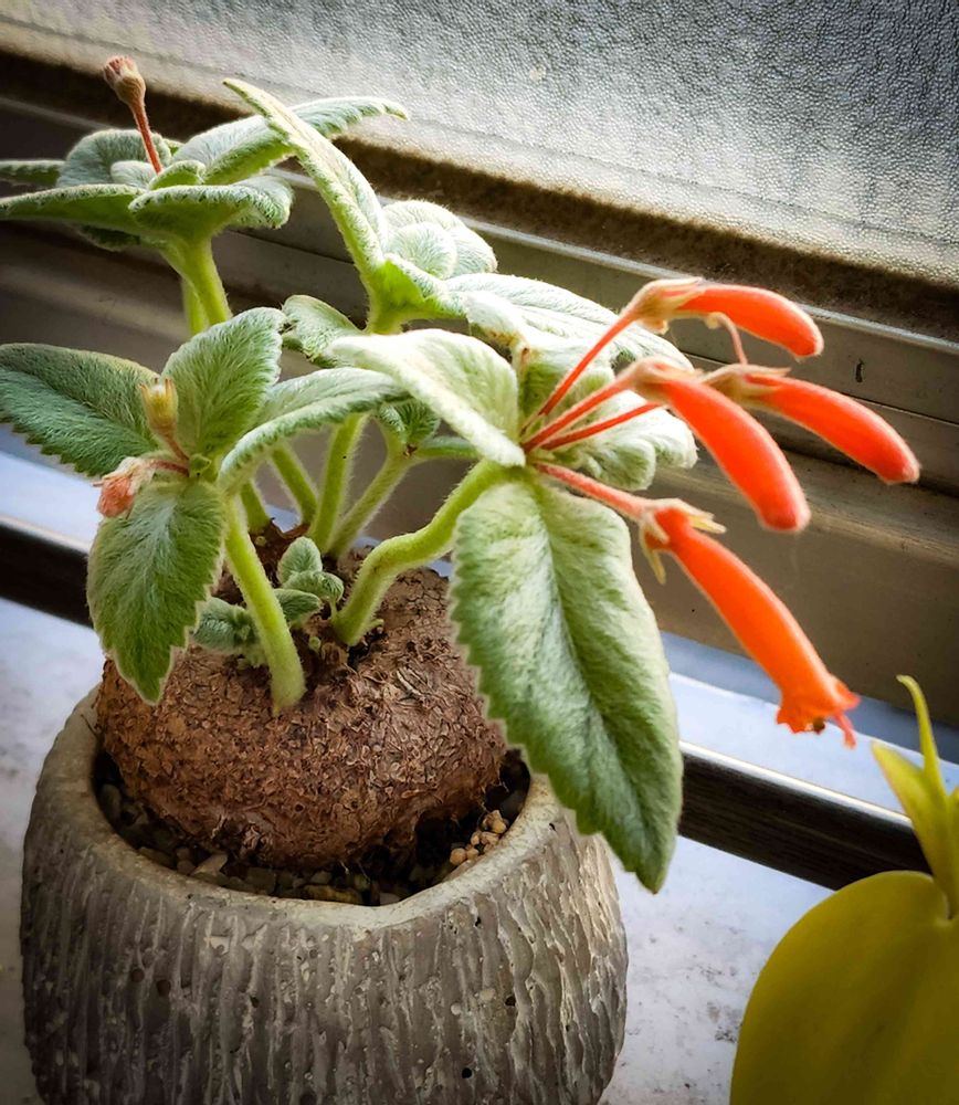 塊根芋にもふもふシルバーの葉っぱ、朱色の花