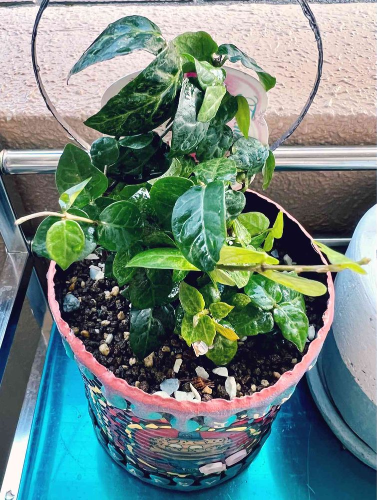 あのピンクの新芽の面影もなく 常に真緑色の葉が伸び伸びになってたので 伸びた茎を切って差し木してみました☝️