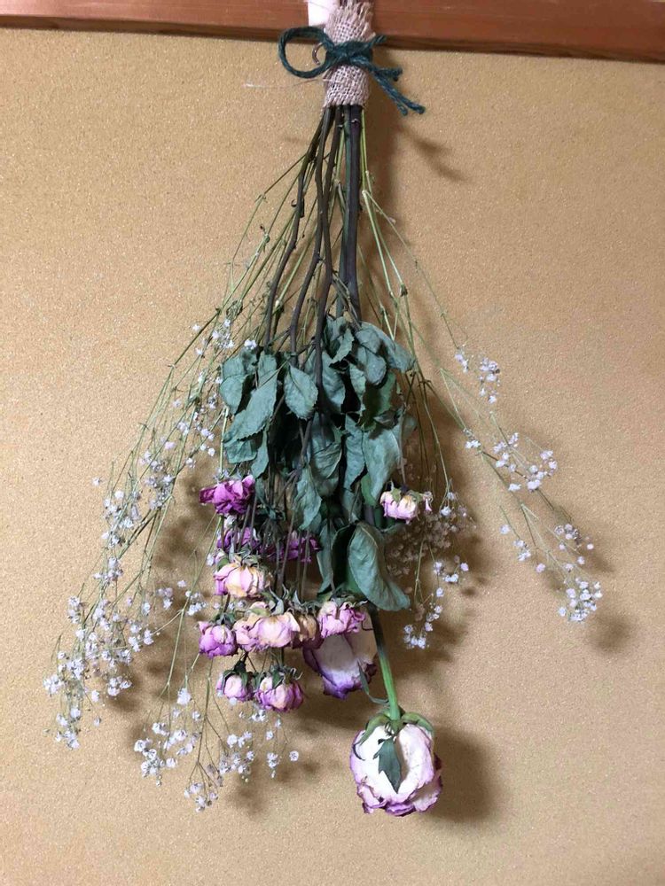 4月末の誕生日に頂いたバラとかすみ草です。大切な思い出を残す為にドライフラワーにして、スワッグに仕上がりました🎶😍💞