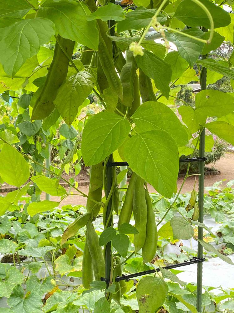 成長旺盛なつる性の一年草で、大柄な三出複葉が特徴的です。8月をすぎると長さ30-40cmを超えるような幅広で大きな莢がぶら下がります。