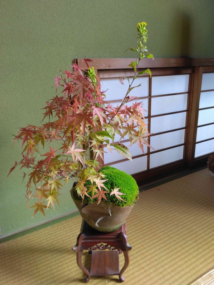 紅葉したモミジとアキノキリンソウと青々とした苔、素晴らしいアレンジです😊