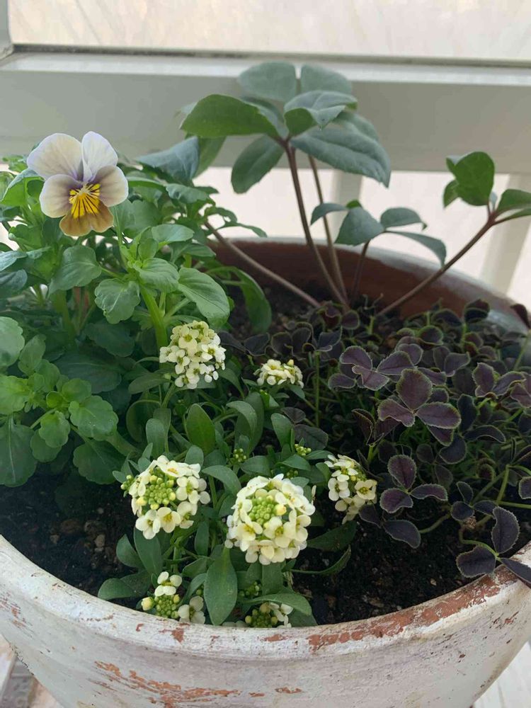 寄植えにはフロステッドチョコレートをお迎え。根っこを整理したのでアリッサムとクローバーも♪ いい季節ですね☺️