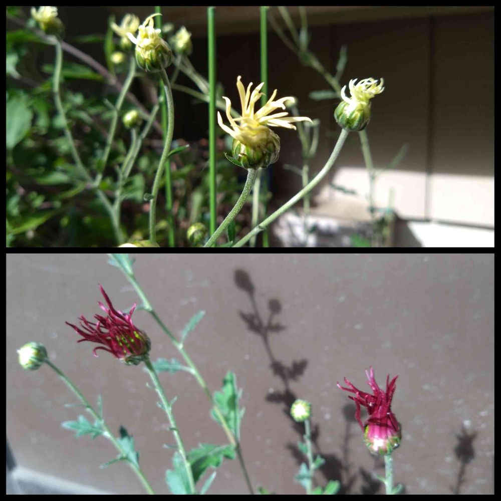 ねじれていますが、これから筒状花弁の一重咲きで咲いてくれるはず。