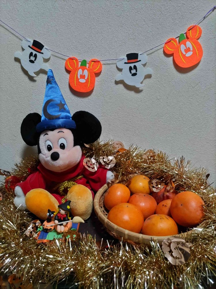 実父より柿のお届けもの💗食後に頂きました。甘くて美味しかったよって(笑)食べた後に📸を撮るのを忘れてしまった残りの柿です🙏10月最後の日は孫の好きなミッキーにも登場してもらいました👻💀☠️🦇🍬🍭🧛🦸
