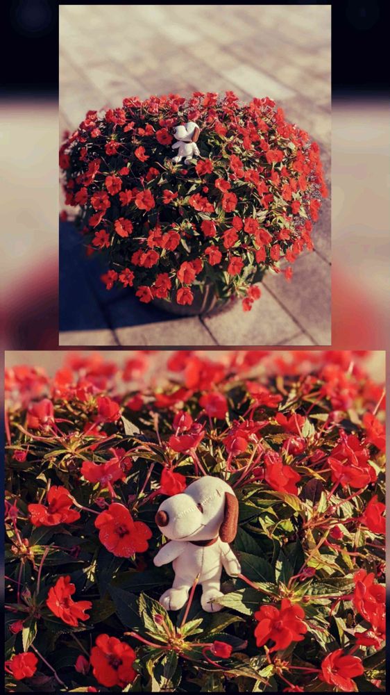 真っ赤なお花、インパチェンスかな?スヌーピーちゃんによく似合ってて可愛いです🥰
