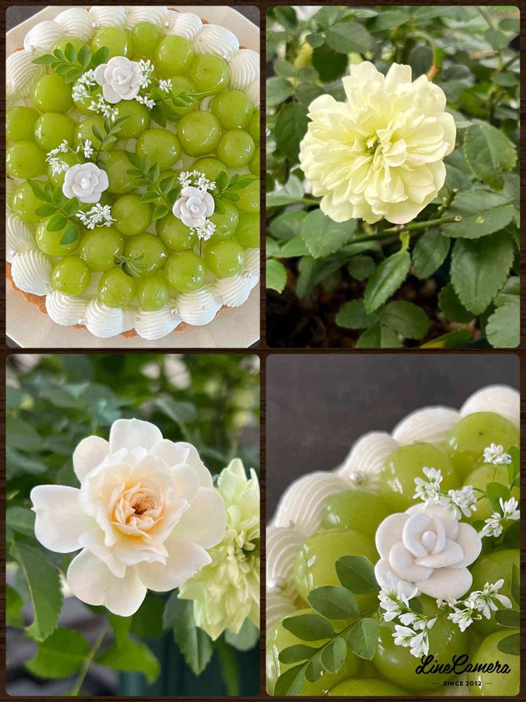 今日のシャインマスカットのタルトは飾りに手作りの白い薔薇にユーフォルビアとジャスミンの葉で飾りましたよ。