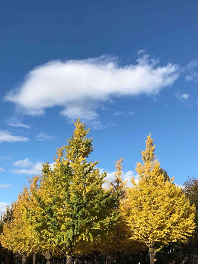 日曜日にイチョウ並木を見て来ました。すごい人なので上部分をパチリ📱。空にポッカリふわふわ雲。