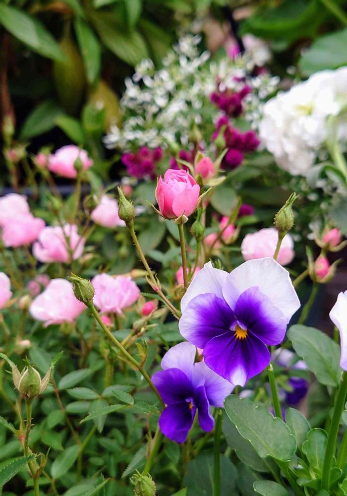 ビオラとミニバラの共演です😃🥀💜 我が家の花壇も秋らしくなりました~。◕‿◕。🤗