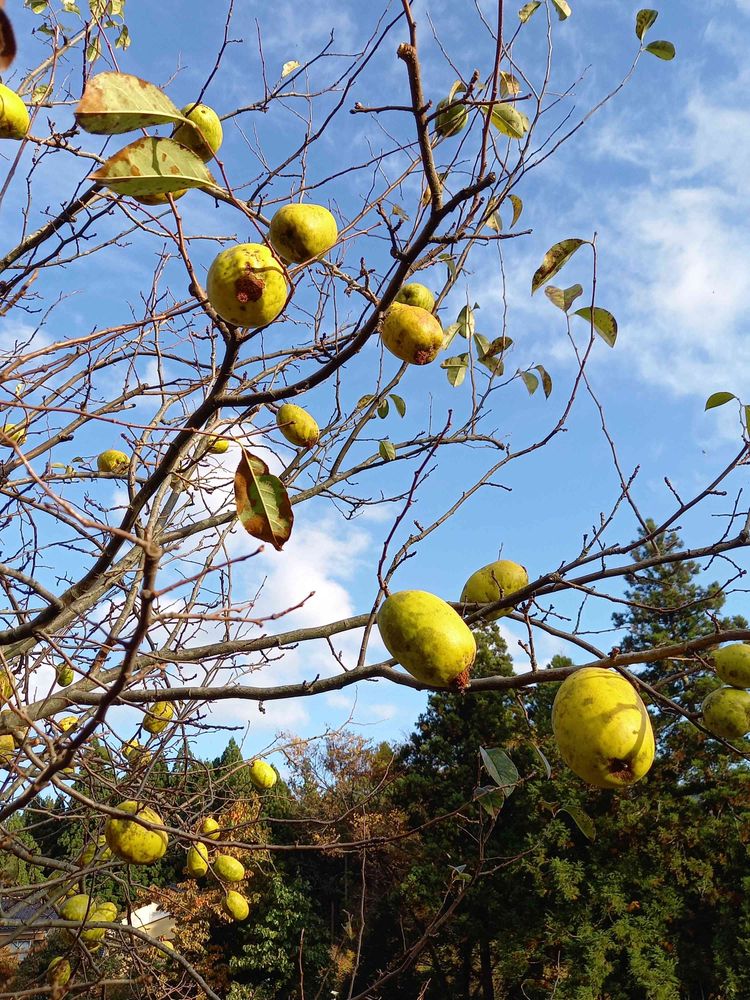 近所の花梨は実が突き刺さっているように見えるけど、これもちょっとだけそう見えるかも🤭
