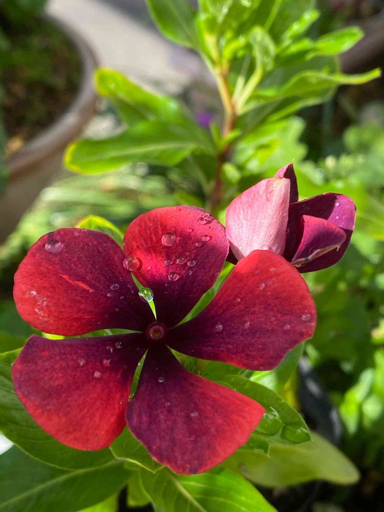 ☘️ニチニチソウ[タトゥー]☘️.....ありがとう💕🫧🫧先日花友さんの来訪でいただいたこのお花❣️少しの陽射しに怪しくきらめいたこの姿、なかなかシックです✨✨💃🕺💃🕺💃✨👌
