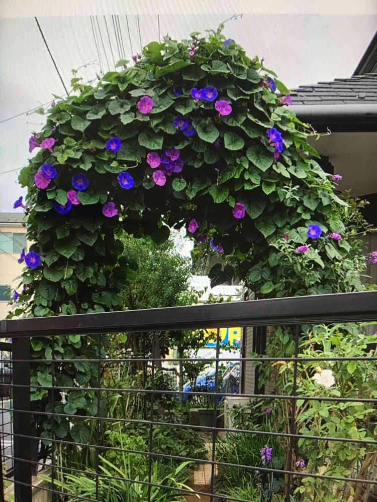 散歩道 一階の屋根にも届く大きなアーチに2色の朝顔が綺麗❣️