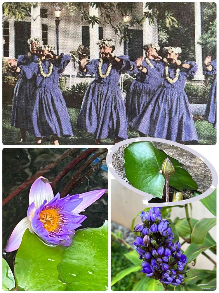 🪷ご近所で咲いた、睡蓮と名前がわからないのですが紫の花を、フラの衣装の色と