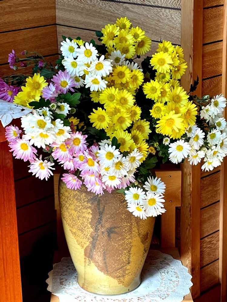菊も色とりどりで綺麗だけど、生け方が素敵ですね。花瓶がまた素晴らしい💖菊に良くマッチしています✌️✨