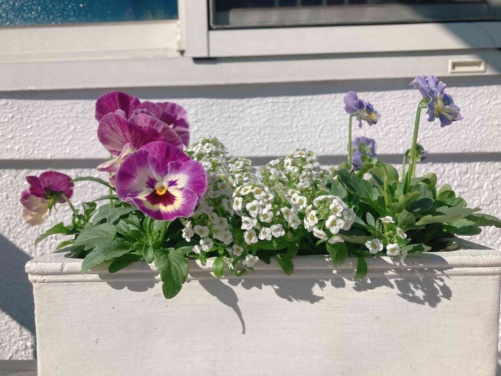 花数が増えてきた。ビオラは小花がかわいいし、パンジーは存在感がある大きさで、真ん中のアリッサムもかわいくて気に入ってます😆