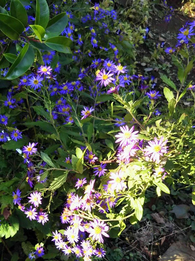 お日さまが眩しい秋の夕暮れに、紫の小花達が賑やかに咲いていました🍀