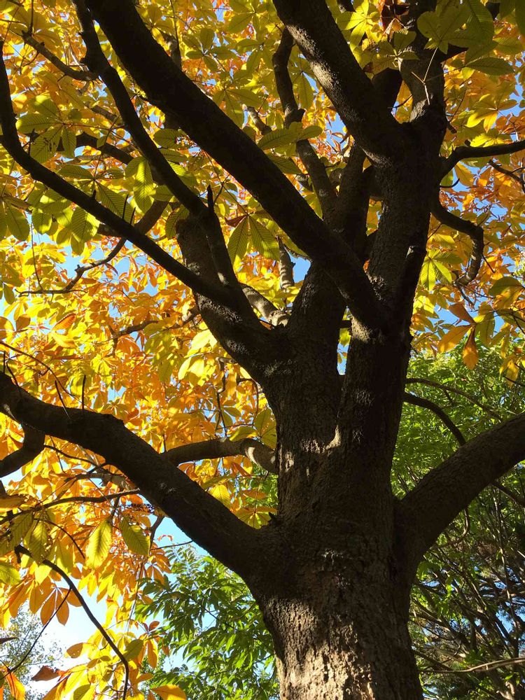 黒々とした太い幹と枝、紅葉した葉っぱ🍁、絵画のような美しさですね✨✨✨