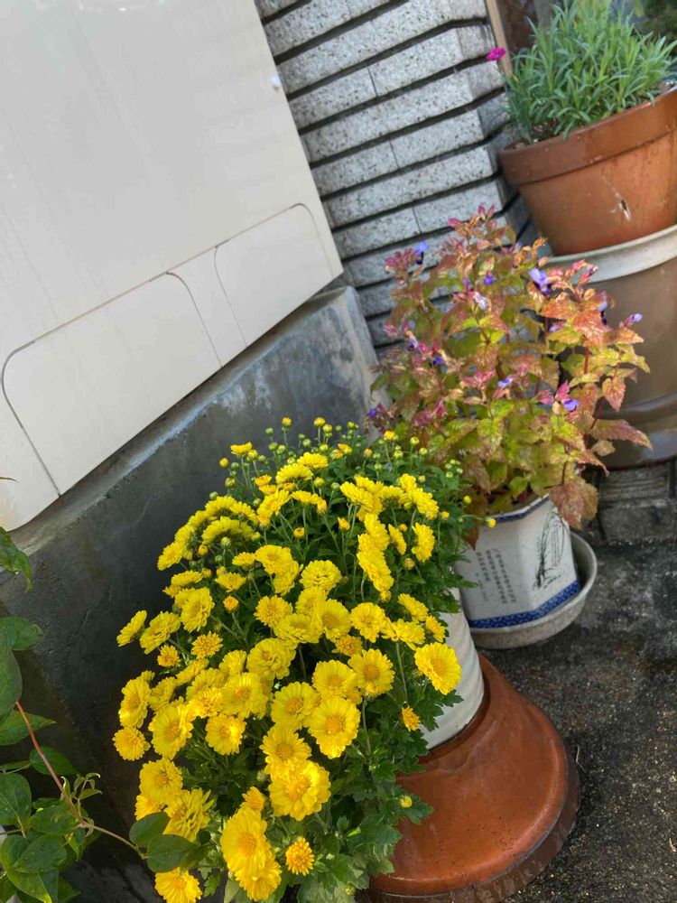 黄菊が満開です🎶トレニアは、葉が色づき⁉️秋色のコラボです❣️