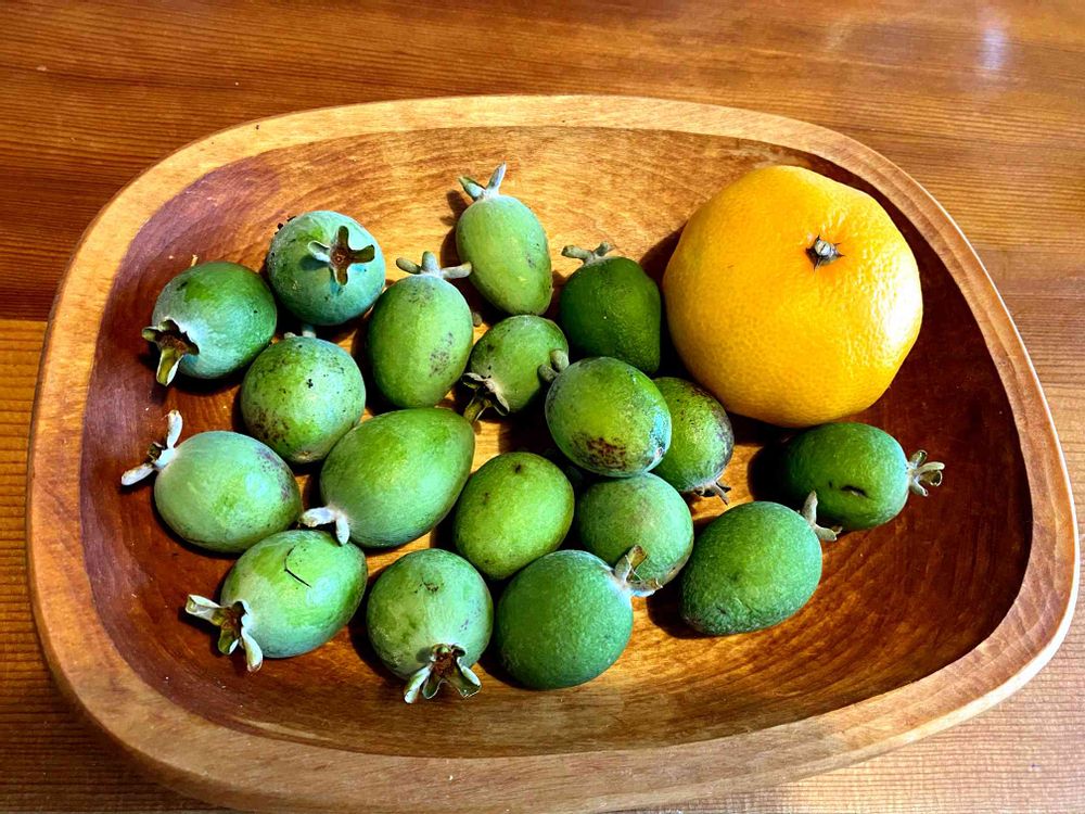 フェイジョアの実が落ち始めました。小さな苗木を植えて4年。今年は今までで1番の出来です。小ぶりですが、追熟させてから食べています。