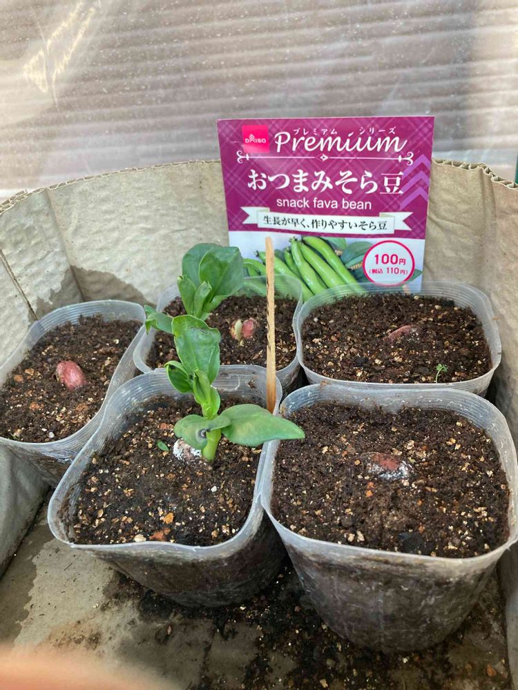 ダイソープレミアムのおつまみそら豆、発芽までに2週間ほどかかりました。