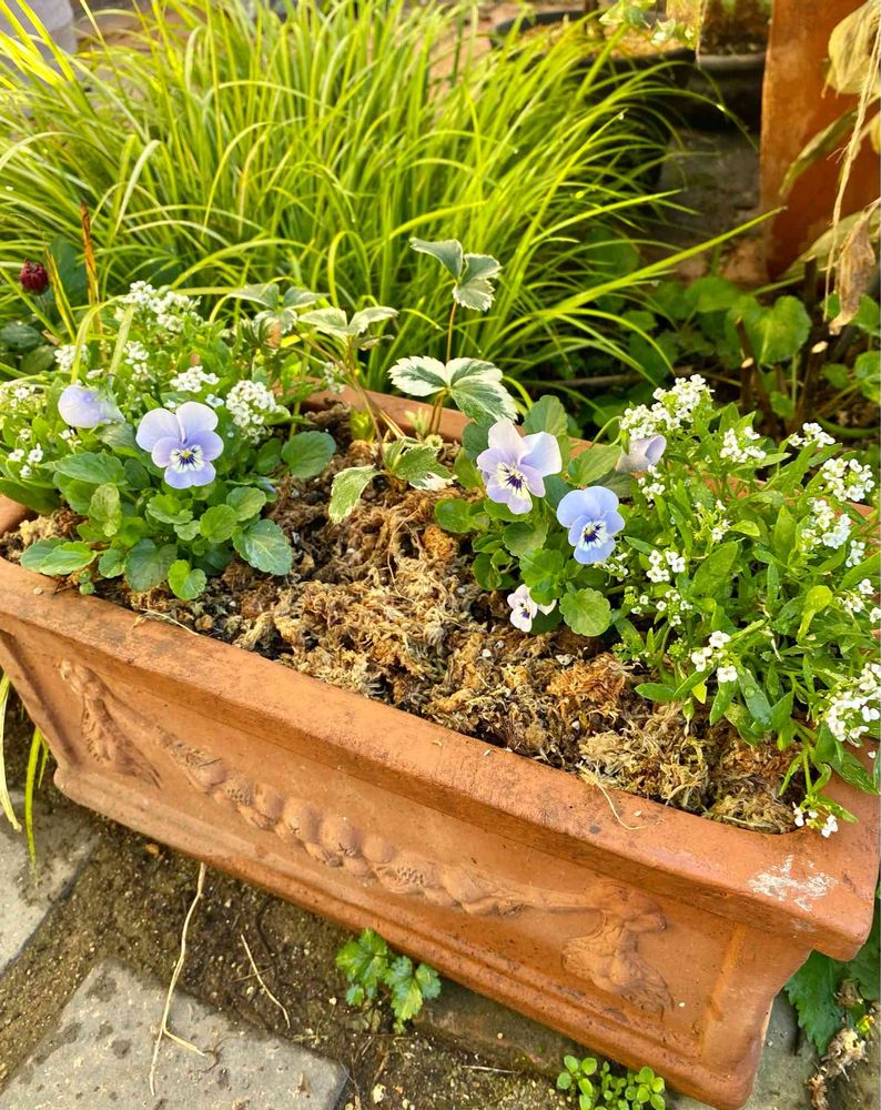 大好きなビオラマリーナとアリッサムの寄せ植えです🌱下にチューリップの球根をたくさん仕込みました😆